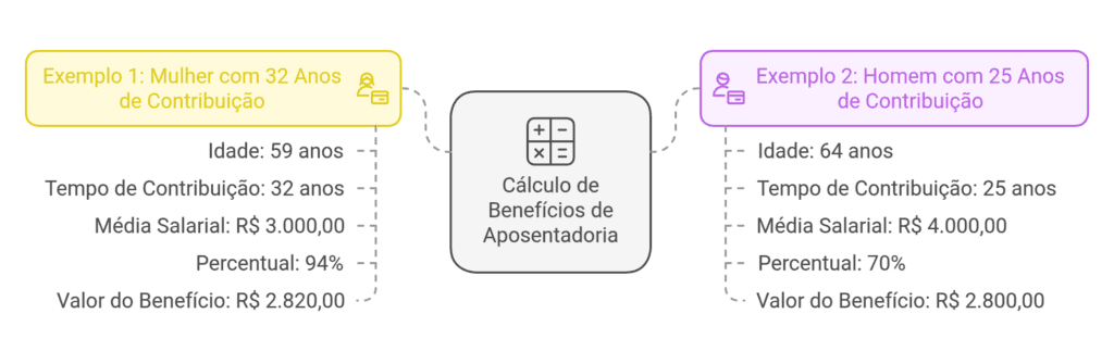Considere os seguintes exemplos para ilustrar o cálculo, e entenda com maior profundidade e na prática como funciona o cálculo da aposentadoria por tempo de contribuição em 2025: