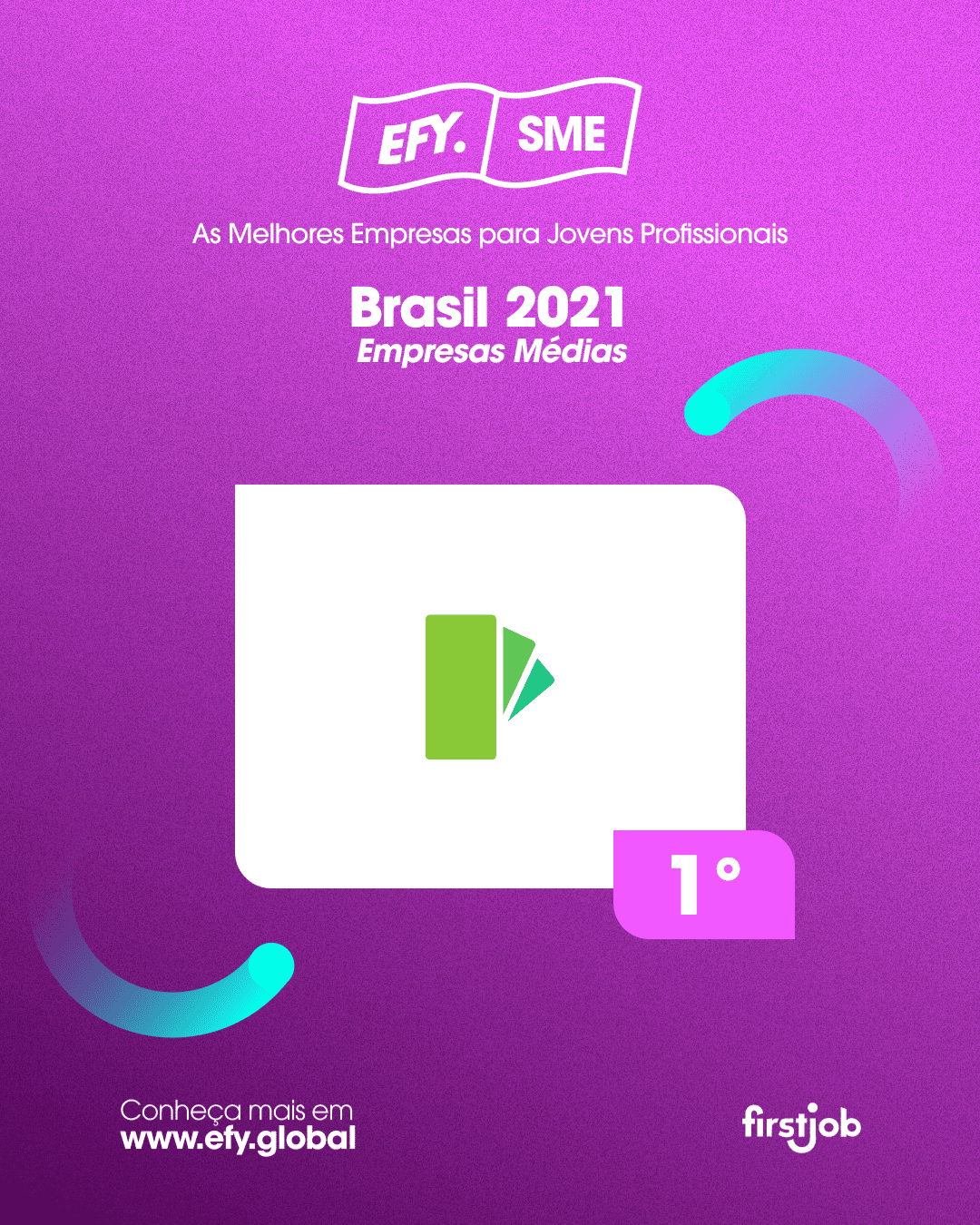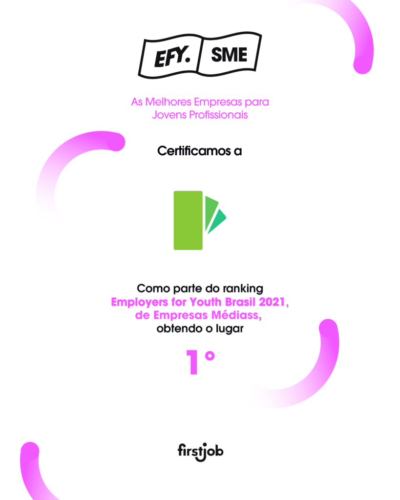 Esse ano conquistamos o primeiro lugar das Melhores Empresas para Jovens Profissionais do Brasil, na categoria de Pequenas e Médias Empresas, segundo o estudo Employers for Youth 2021.